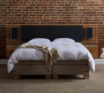 Ein handwerklich gefertigtes Kopfteil aus Massivholz, ausgestattet mit innovativer Technologie von Bang & Olufsen. Entworfen und entwickelt in Zusammenarbeit zwischen Bang & Olufsen und DUX.