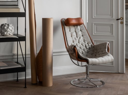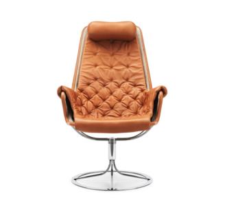 Iconische fauteuil ontworpen door Bruno Mathsson. De Jetson-stoel weerspiegelt zowel zijn obsessie met comfort als een klassieke Zweedse moderne designbenadering. De fauteuil heeft een komvormige zitting en een ergonomisch ontworpen hoge rug met hoofdkussen. Verchroomde draaivoet met uniek terugkeermechanisme.