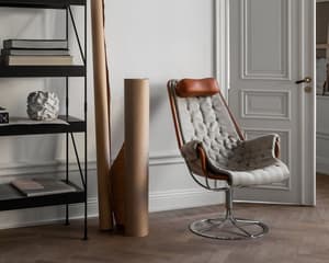 Iconische fauteuil ontworpen door Bruno Mathsson. De Jetson-stoel weerspiegelt zowel zijn obsessie met comfort als een klassieke Zweedse moderne designbenadering. De fauteuil heeft een komvormige zitting en een ergonomisch ontworpen hoge rug met hoofdkussen. Verchroomde draaivoet met uniek terugkeermechanisme.