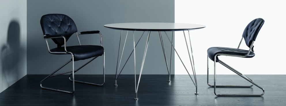 Ronde cafétafel die aanzet tot gesprekken en oogcontact met alle gasten. Ook verkrijgbaar als eettafel of als eettafel met twee uittrekbare delen.